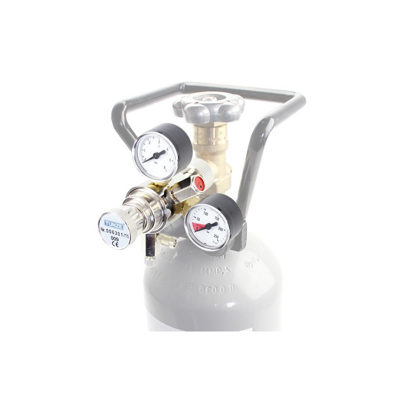 Precision device with fine adjustment for standard CO2 cylinders, thread in keeping with German standard DIN 477 (US version with CGA 320 thread).