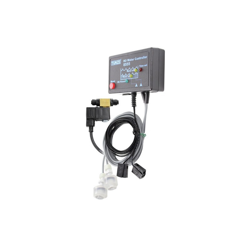 TUNZE® RO Water Controller 8555 is an automatic water level controller used in the collection container of TUNZE® RO station. The controller is also suitable for other water tanks or can be connected to an automatic refill system. It consists of a controller, two sensors, a water valve and an 12 V power supply unit. Depending on the use, the water valve can be replaced by switched socket outlet 3150.110 for mains operation.